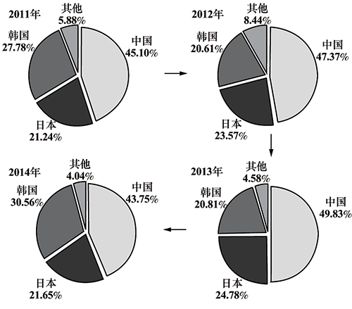 圖2 2011-2014年中日韓正極材料企業(yè)市場(chǎng)份額變化